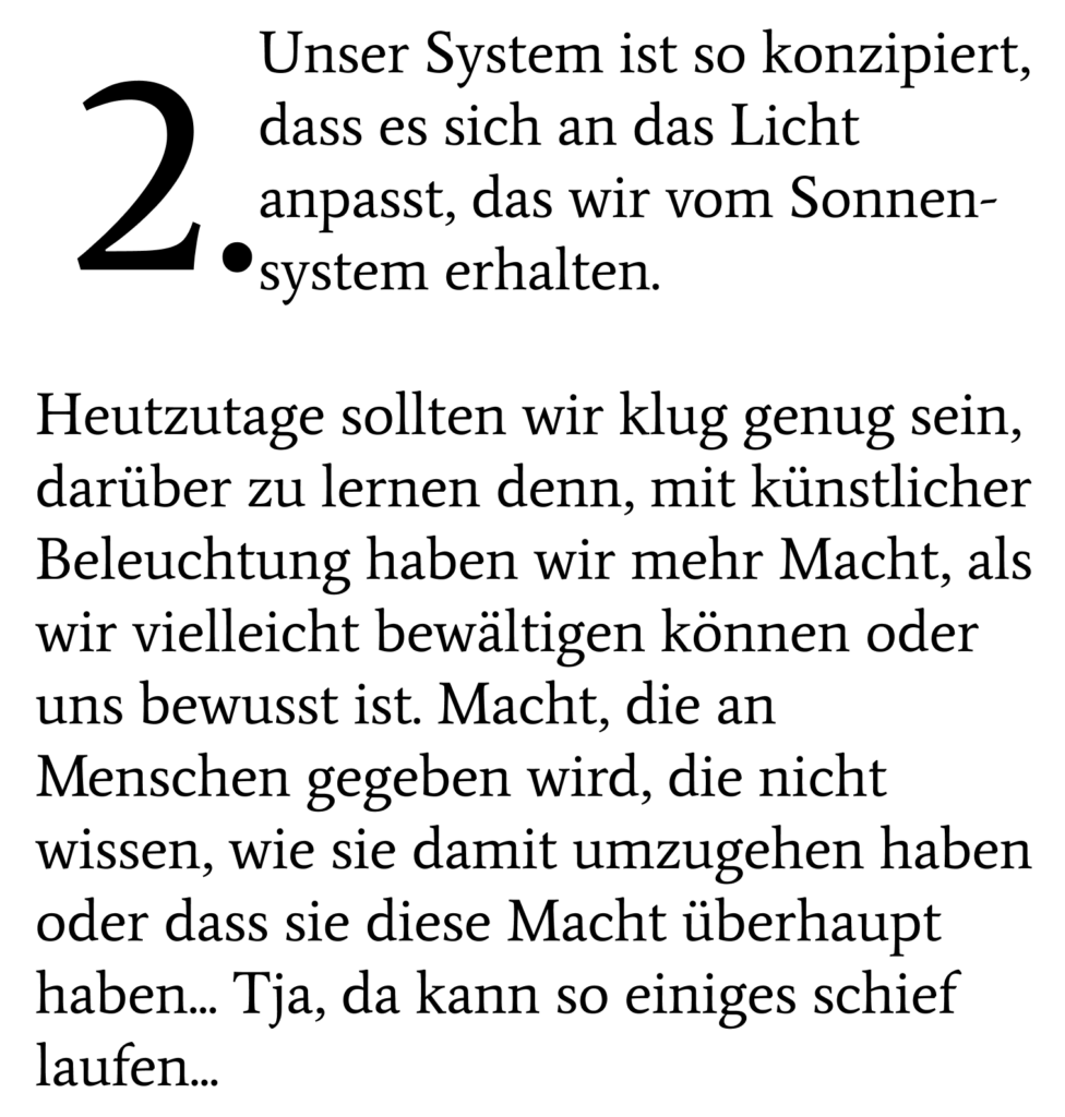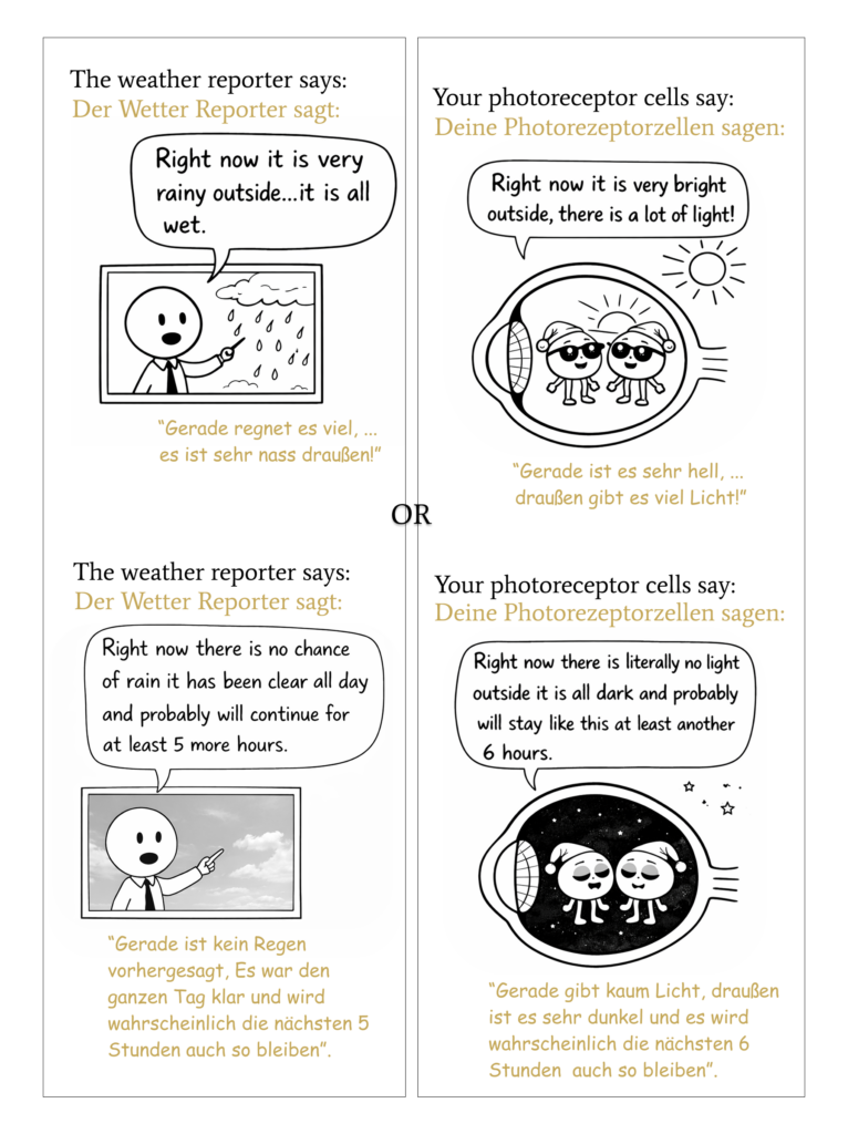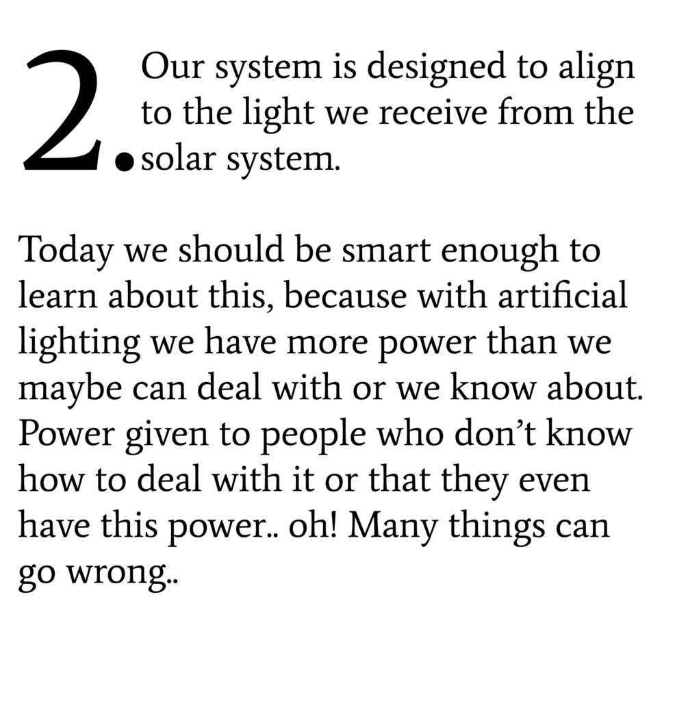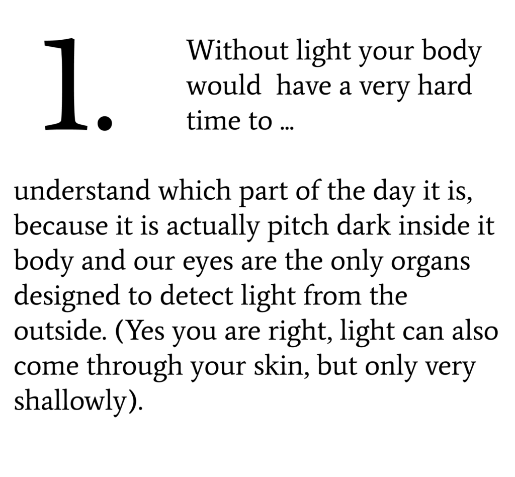 …is the main signal for this circadian clock. 2. Because of this clock your Brian knows what ‘time’ it is. 3. This process happens through your eyes. (More about this in a later Post, soon!)